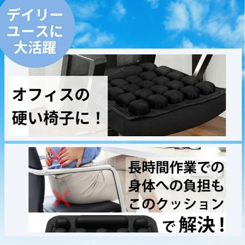 約7cmの大型エアセルが体圧を効率的に分散し、まるで浮いているような座り心地を実現します。