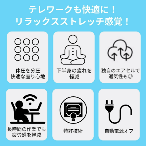 エアセル同士が中で繋がっており、座った時の圧力により瞬時に中で空気が移動し、圧力を分散します。
