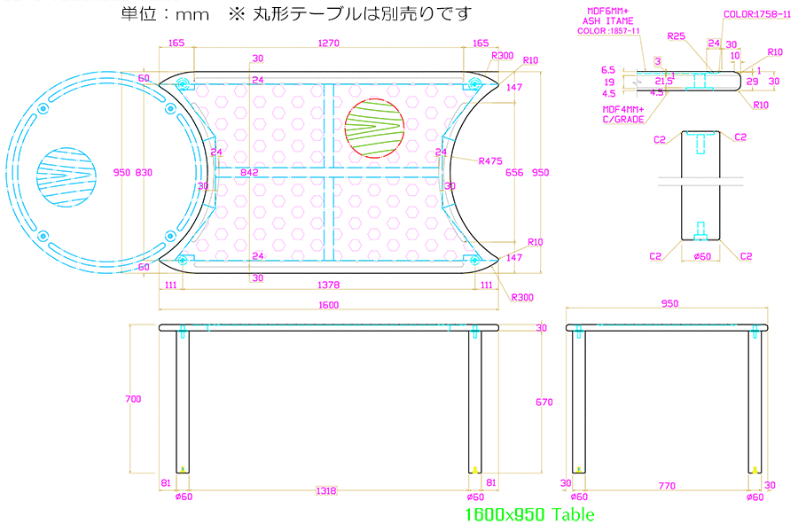 ・ 長方形と円形の2種のテーブルを自在に組み合わせ、どのような広がりも作れるフリーレイアウトテーブルです。