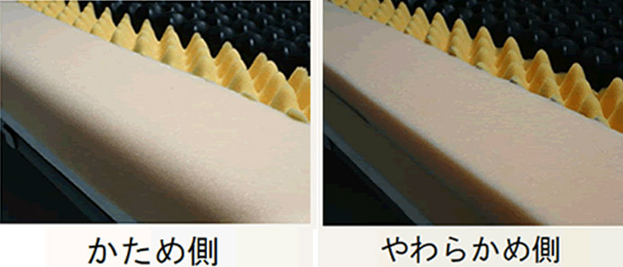 立ち上がりのしやすさ・端座位時の安定性を求める方は「かため側」、端座位姿勢で長時間過ごされる方には、座り心地の良い「やわらかめ側」と使い分けができます。