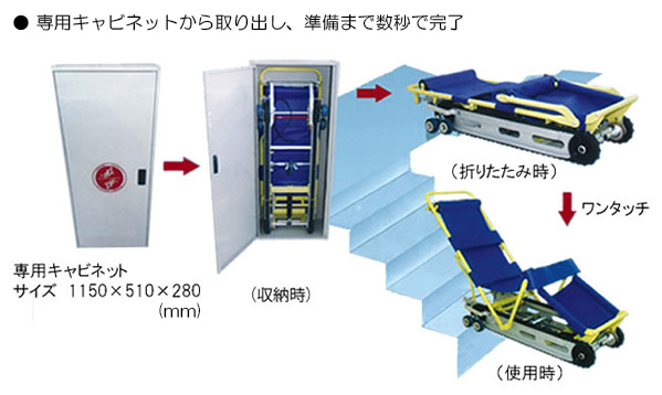 非常用階段避難車 キャリダン CD-8用のオプション収納用キャビネットです。キャリダンを立てて収納でき、非常時はすぐに取り出すことができます。※ 商品にキャリダン本体は含まれません。