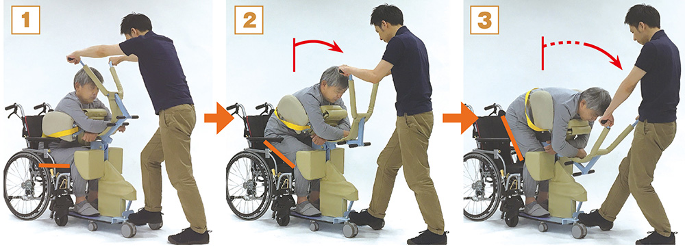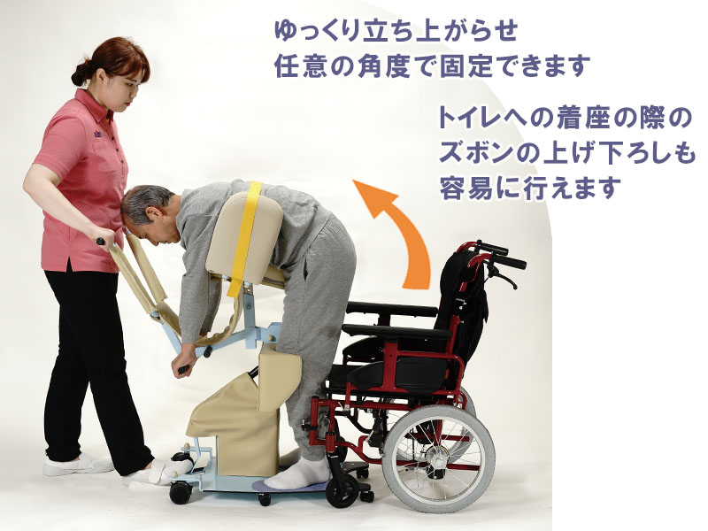 ベッド~車いす~トイレの移乗がスリングシートを使わずに行なえます。起立と着座はテコの原理を利用した操作で、ガス圧で動作するダンパーにより女性でも容易です。