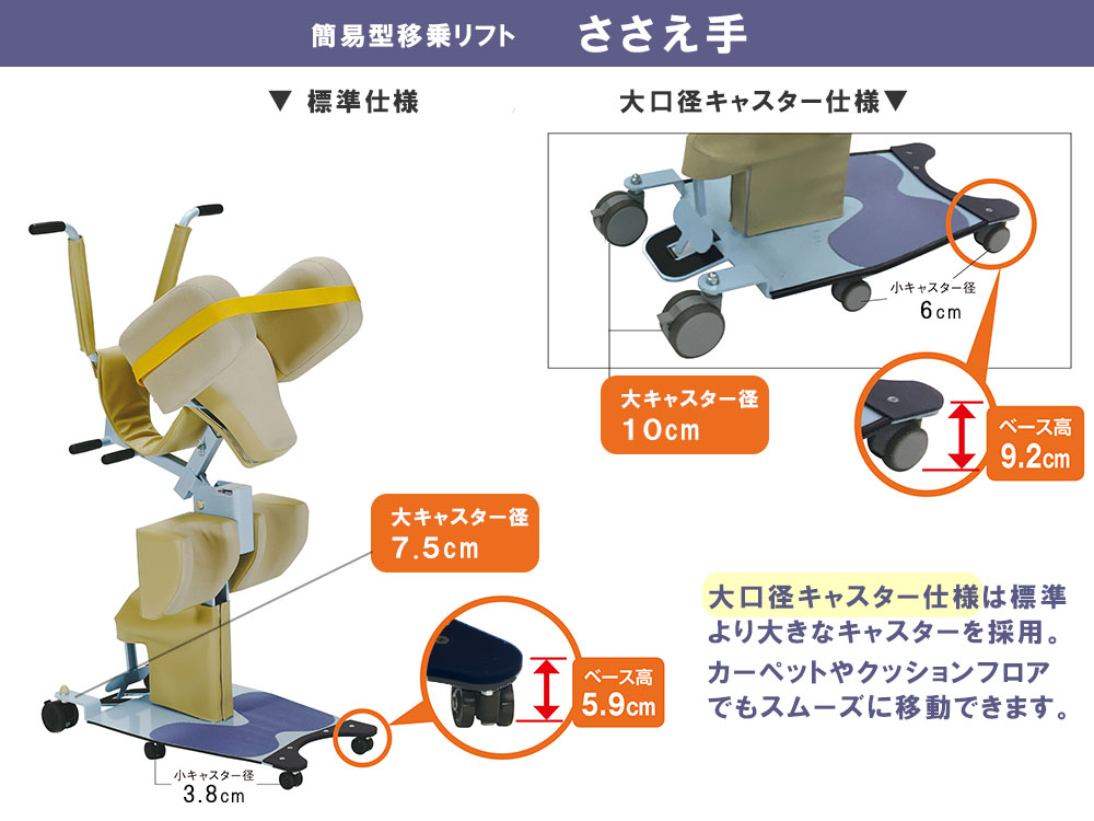 ・ 利用者は常に床面(ささえ手ベース部)に足底が接した状態です。そのため スリングシートを必要とする介護リフトとは違い、吊り上げによる振り子の現象は起きません。